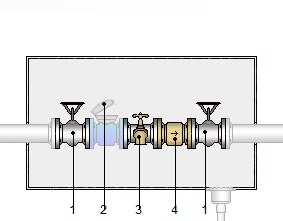 Pré-instalação de contador geral de água 1 1/2" DN 40 mm, colocado em armário pré-fabricado, ligado ao ramal de ligação e ao ramal de introdução, formada por duas válvulas de corte de esfera de latão niquelado; torneira de purga e válvula de retenção. Inclusive fechadura especial de secção quadrada e material auxiliar.