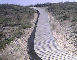 Passadiço formado por tábuas de madeira maciça, de pinheiro-bravo (Pinus pinaster), de 45x140x2050 mm, cor castanho, tratada em autoclave através do método Bethell, com classe de risco 4 segundo NP EN 335, sobre uma base existente. Inclusive peças especiais. | ||
