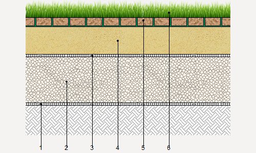 Pavimento drenante, para tráfego pedonal, com uma resistência à compressão de 400 N/mm², formado por geotêxtil não tecido composto por fibras de poliéster entrelaçadas, (120 g/m²), camada de drenagem compactada de brita filtrante não seleccionada, de 20 cm de espessura, geotêxtil não tecido composto por fibras de poliéster entrelaçadas, (120 g/m²), camada de nivelação compactada de areia com granulometria de 0 a 5 mm de diâmetro, limpa, de 4 cm de espessura, painel alveolar de polietileno e polipropileno, de 49,2x49,2x3,9 cm, cor verde, com geotêxtil de polipropileno incorporado numa das suas faces e camada de enchimento de terra vegetal crivada e mistura de sementes para relva cobrindo a placa alveolar. | ||