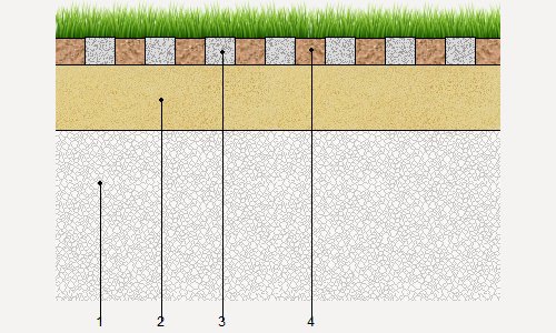 | Pavimento drenante, com peças pré-fabricadas de betão e relva | ||
