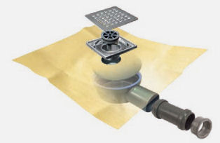 Kit Sumi Basic "REVESTECH", formado por lâmina impermeabilizante flexível tipo EVAC Dry40 de 1500x2000 mm composta por uma folha dupla de poliolefina termoplástica com acetato de vinil etileno, com ambas as faces revestidas de fibras de poliéster não tecidas, de 0,47 mm de espessura e 290 g/m², segundo EN 13956, com união termoselada ao sumidouro sifonado de PVC de 60 mm de altura, saída horizontal de 40 mm de diâmetro, com grelha para encastrar de aço inoxidável modelo Cuadros de 105x105 mm e lâmina impermeabilizante flexível tipo EVAC Dry40 de 1500x2000 mm, para impermeabilização e drenagem de chuveiro executado "in situ".