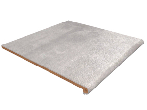 Revestimento de degrau de escada exterior, com peças de grés esmaltado, formado por cobertor com canto arredondado, e espelho, gama média, capacidade de absorção de água E<3%, grupo BIb, segundo NP EN 14411, com resistência ao deslizamento maior que 45 segundo ENV 12633. COLOCAÇÃO: em camada fina e através de colagem simples com cimento cola melhorado, C2 TE, segundo NP EN 12004, com deslizamento reduzido e tempo de colocação ampliado. ENCHIMENTO DE JUNTAS: com argamassa de juntas cimentosa melhorada, com absorção de água reduzida e resistência elevada à abrasão tipo CG 2 W A, cor branco, em juntas de 2 mm de espessura.