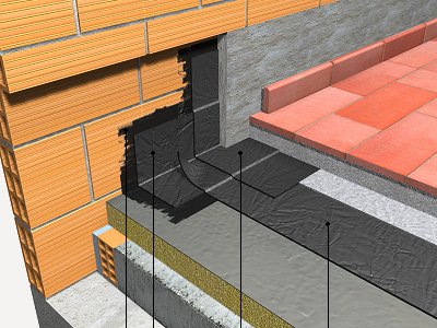 Encontro de cobertura plana acessível, não ventilada com paramento vertical. Impermeabilização com lâminas asfálticas