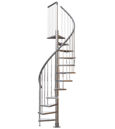 Escada metálica em caracol para um piso interior de habitação, de até 3,00 m de altura livre, de 0,60 m de largura, formada com perfis de aço laminado a frio, formando uma árvore central de 100 mm de diâmetro, degraus de chapa estampada de 3 mm de espessura, guarda formada por barras verticais de varão de aço liso e corrimão com acabamento em PVC. Inclusive elementos de ancoragem. | ||